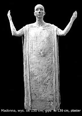 First Madonna refers to ancient sculptures of gods; shows pagan roots of Christianity and the area of spirituality which is universal for every religion. The second shows what is specific for Catholicism, what distinguishes it from other confessions. The sculptures complete each other – the two kinds of religiousness are not opposite but only together can create emotional and cultural whole. Both Madonnas are pregnant, what emphasis fertility and corporeality, physiology of Mary, her femininity in biological aspect.