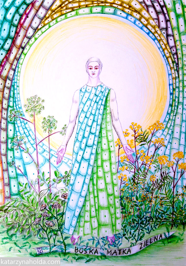 Divine Mother, Great Mother, Goddess – Plant, Holly Mary, Mother Nature, Goddess Nature. In August we celebrate pagan hollyday of goddess of nature, plants and harvest, which is assimilated by catholic church as Assumption of Mary. In Poland this hollyday is also know as Matki Boskiej Zielnej (in literal translation Holly Herbaceous Mother). On August 15 people devote to Mary bouquets of plants that bloom and bear fruit at this time of a year.